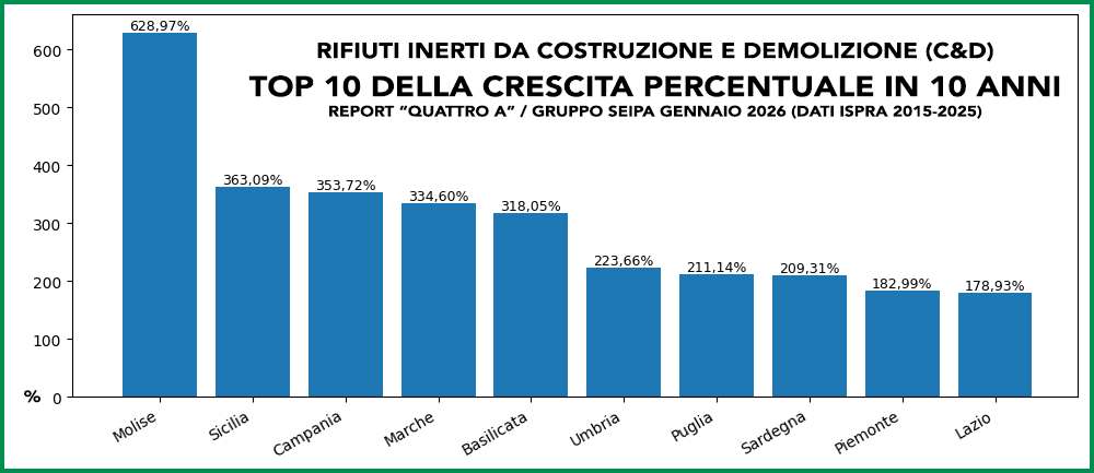 Accanto ai grandi numeri del Nord, emerge però con forza la dinamica del Mezzogiorno. Campania e Sicilia mostrano incrementi tra i più elevati a livello nazionale: la prima passa da 1.807.310 a 6.392.809 tonnellate (353,72%), la seconda da 1.638.849 a 5.950.524 tonnellate (363,09%). Numeri che segnalano una crescita intensa dell’attività edilizia e delle operazioni di rigenerazione urbana, ma anche un forte aumento dei flussi di materiali da gestire.