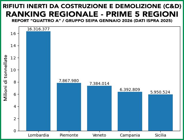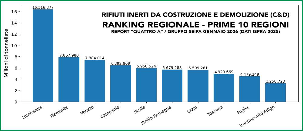 Roma, 28 gennaio 2026 – La Geografia dei rifiuti inerti da costruzione e demolizione (C&D) restituisce l’immagine di un’Italia in profonda trasformazione. A raccontarla è Quattro A, società del Gruppo Seipa attivanei settori estrattivo, di trasporto, recupero e riciclo dei materiali inerti e di supporto alle opere infrastrutturali ed edili.
