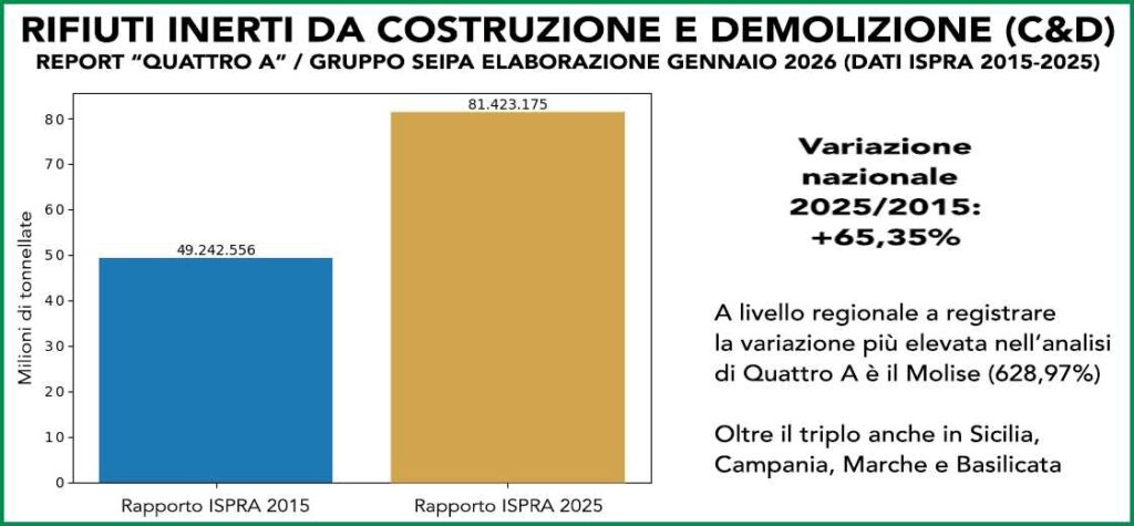 Secondo l’ultima rilevazione dell’Ispra, in Italia sono state prodotte 81.423.175 tonnellate di rifiuti inerti da costruzione e demolizione, contro le 49.242.556 tonnellate indicate nel rapporto 2015. «In 10 anni la variazione complessiva è stata quindi pari al +65,35%» osservano gli analisti di Quattro A.